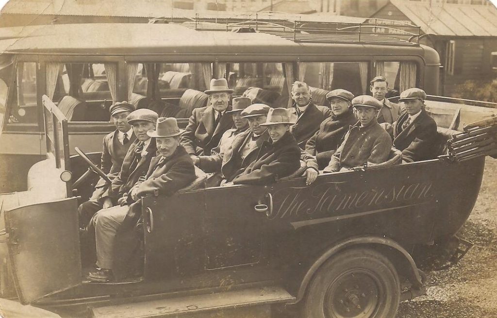 January’s object of the month is rather two objects, a photograph of a 1920s works outing with 12 men sat in an open coach and the second is a photograph of two 1920s Thame FC players.
