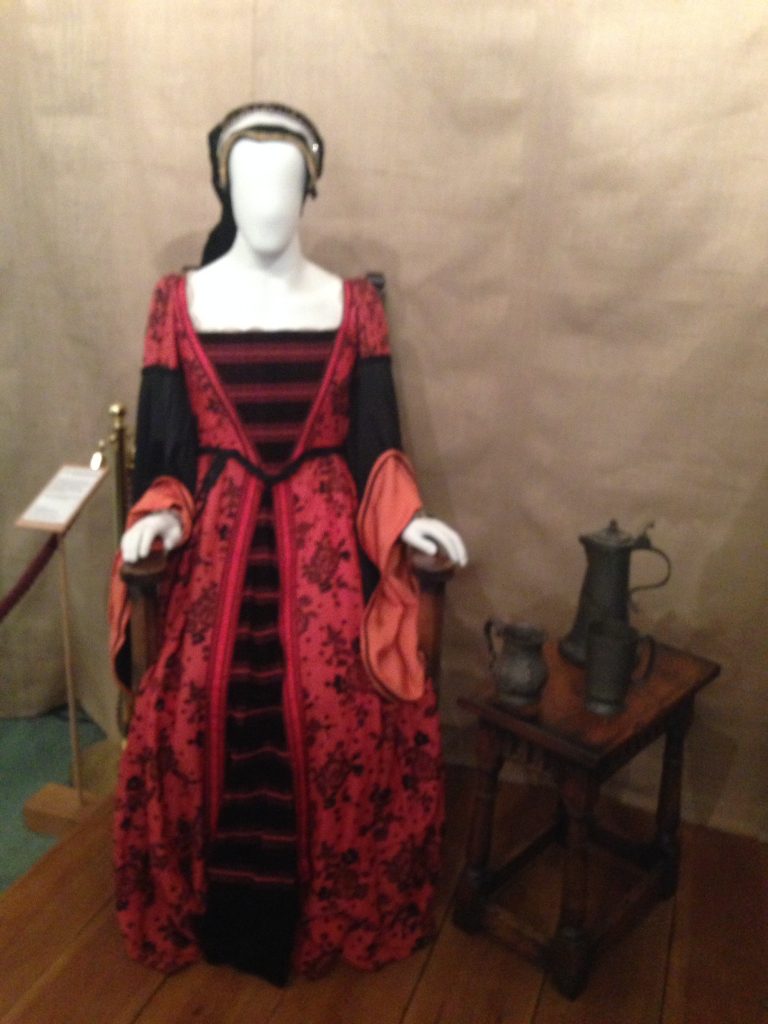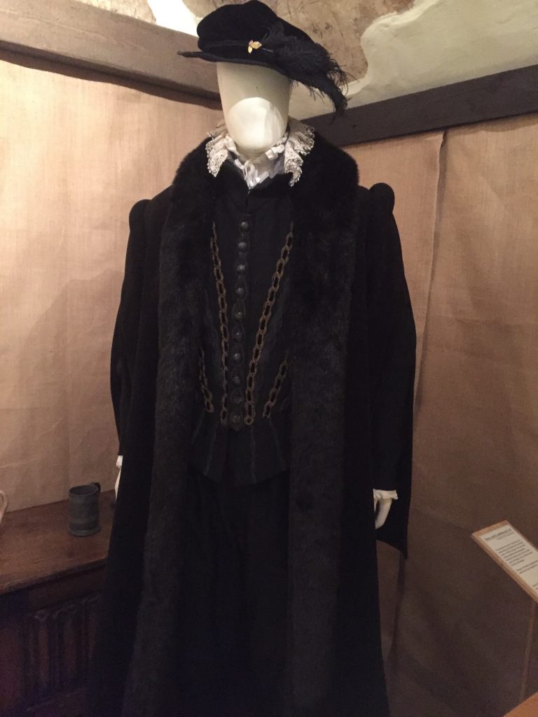 The merchant’s wife is wearing a dress reflecting the period, currently on loan from the Thame Players.