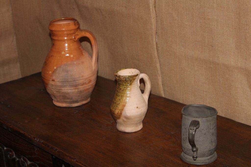 Stoneware Jugs. The stoneware jug and mug are modern reproductions of Brillware made by the Pot Shop in Lincoln. This type of locally produced earthenware was common throughout the Tudor period