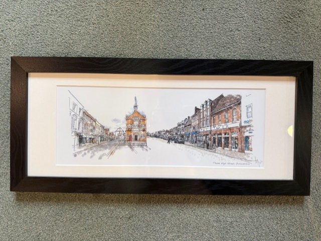 Framed print of Thame High Street with a view towards the Town Hall, by local artist Gerald Bright. One of a series of beautiful and unusual views of Thame 20×8 ins