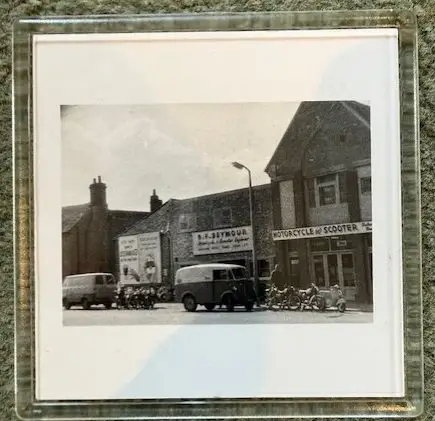Black and white image of the original RF Seymour shop and garage