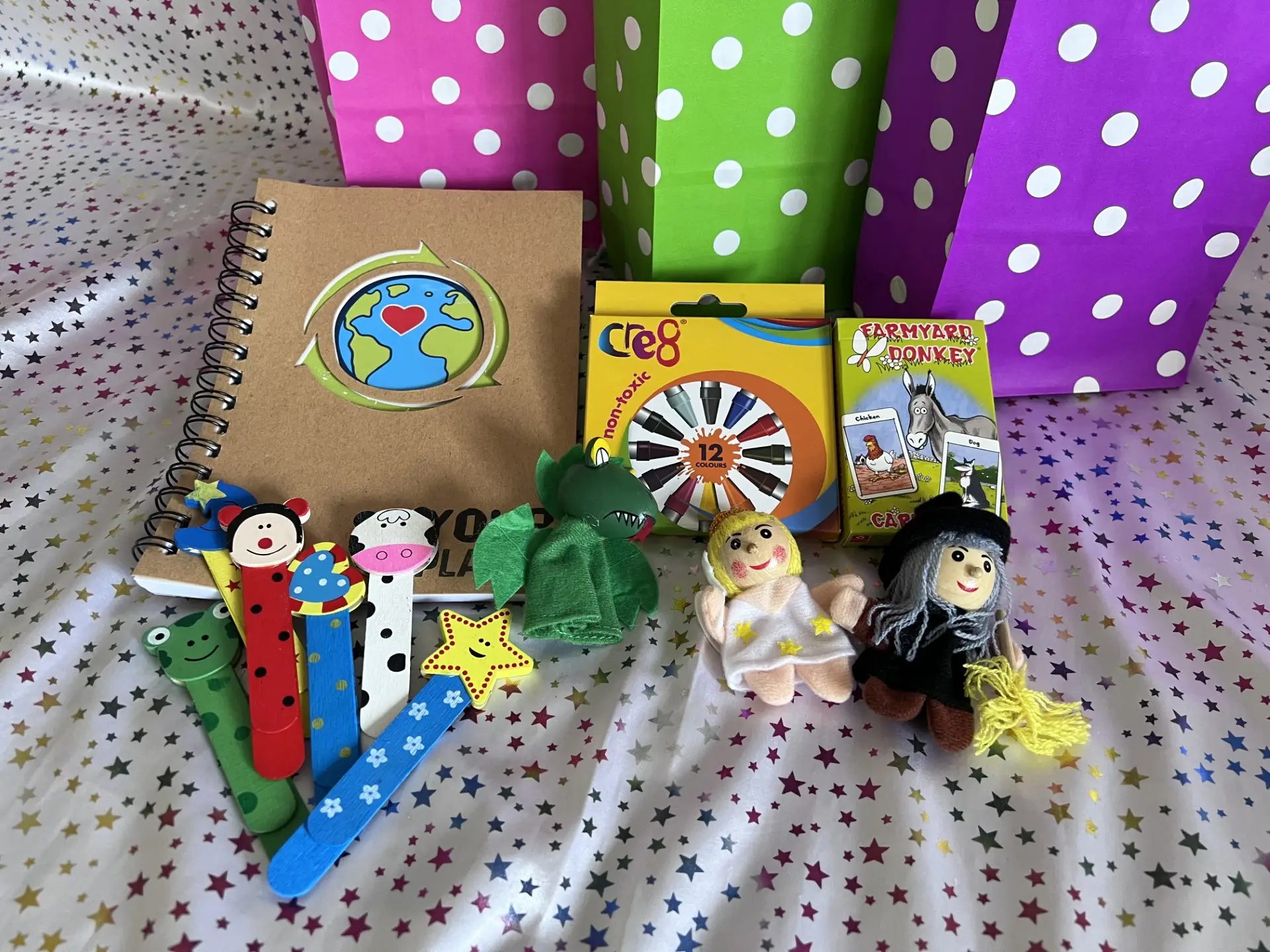 Example pack includes A5 notebook, pack of crayons, wooden bookmark, card games. fairy tale finger puppet. (Contents may vary)