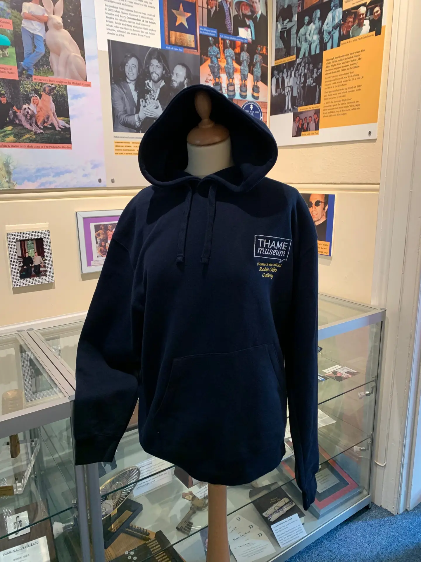 Fleecy Hooded top with embroidered logo – Thame Museum Home of the Robin Gibb Gallery 80% cotton / 20% Polyester. French Navy Blue. Soft feel cotton, fleece brushed cotton inside. Front pouch pocket.